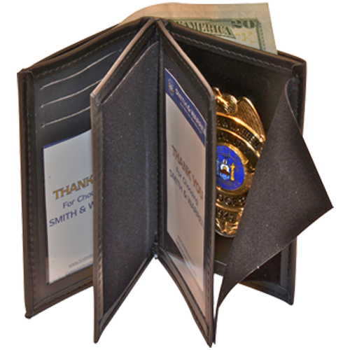 Made from top-grain leather with turned and stitched corners for a high-quality finish, this is the top "federal" style wallet. Some of its prominent features are two separate flipping ID sections, 6 credit card compartments, the badge recessed and well concealed on the right as well as the plastic picture sleeve. The money compartment is bi-fold.