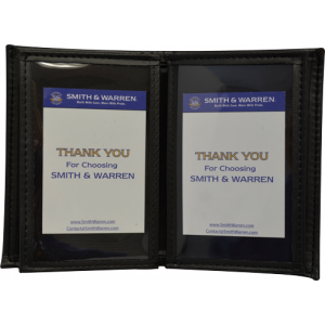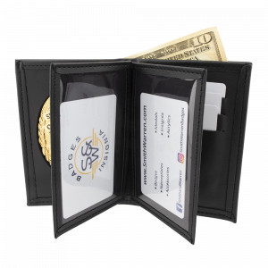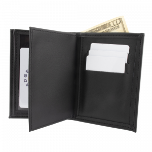Made from top-grain leather with turned and stitched corners for a high-quality finish, this "federal" style wallet fits credentials of any size. Some of its prominent features are two separate flipping ID sections, 3 credit card compartments, the badge safely recessed and concealed on the left and plastic picture sleeve. The money compartment is bi-fold. There is nothing this wallet will not hold. Felt flap is sewn between ID windows for protection.