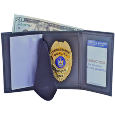 Description:The bill-fold section in this dress leather wallet is tri-fold and the ID compartment is permanently attached on the right side. Badge is well concealed in the center and can be exposed as needed. To the left of the badge you can store up to 3 credit cards. This wallet is supplied with a picture sleeve.
