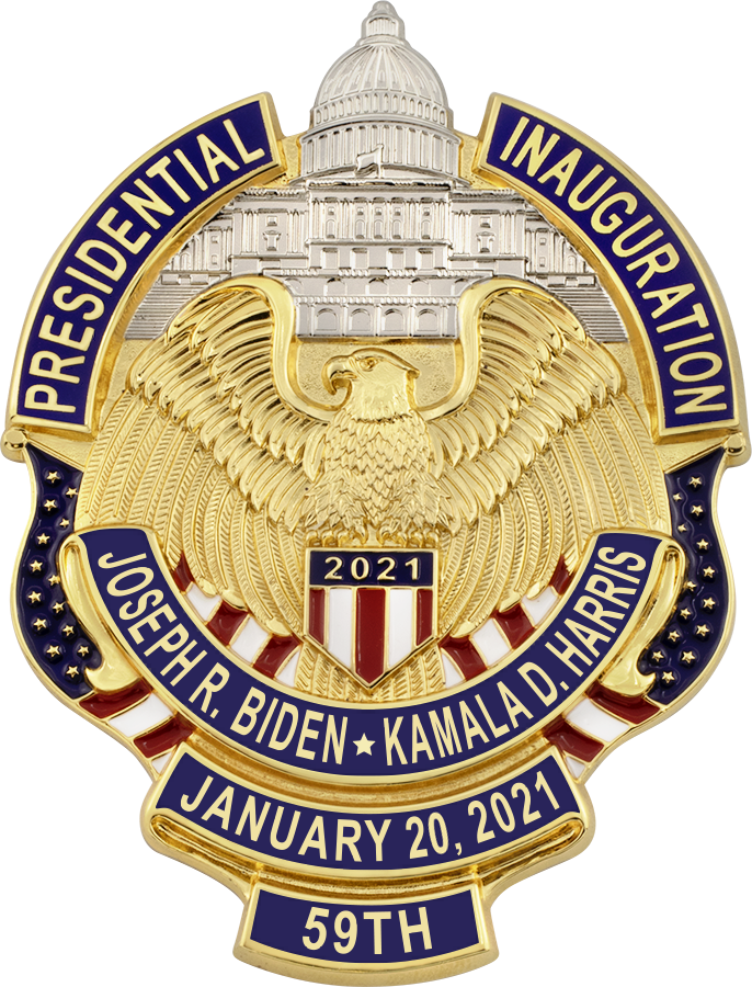 SW-INAUG2021_C - 2021 Biden Harris Inauguration Collectible $180.50 MADE IN THE USA Two-tone electroplated finish, 3.25"H x 2.25"W Hard Cloisonné Enameled Lettering Pin & Safety Catch Attachment Comes in a beautiful presentation box. Finish Gol-Ray Attachment Pin & Safety Catch (Curved Shape)