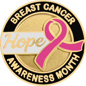 SW-C1017M_G - Breast Cancer Awareness Pin $32.00 Custom Product - Delivery between 3-5 weeks. Breast Cancer Awareness pin measures 15/16" round (just under 1"). Available in Gold or Silver finishes. Sold as each (not sold in pairs). Finish GoldNickelRhodium Attachment Double Clutch Collar Brass Size 15/16" (largest)
