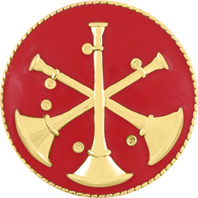 SW-C177RE_G - Three Crossed Bugles $27.50 Three Crossed Bugles Seal Insignia pin sold by the piece (NOT pair). Measures 15/16" in diameter. Comes with 2 pins on the back. Finish GoldRhodiumNickel Attachment Double Clutch