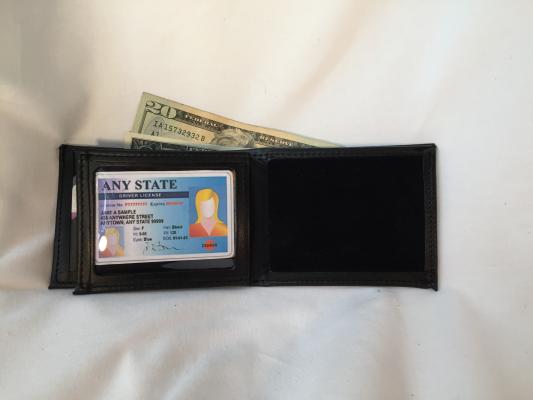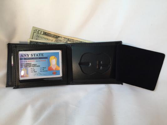 This high quality men's Bi-Fold leather wallet is made from durable professional grade leather. It has a full-color metal DHS medallion on the front. It is precision cut to fit the smaller wallet-sized ICE badge. It is manufactured in the United States by Perfect Fit Shield Wallets in Corinna , ME. This Bi-fold wallet has ample room to store your cash, credit cards and identification. This wallet will provide you years of service.